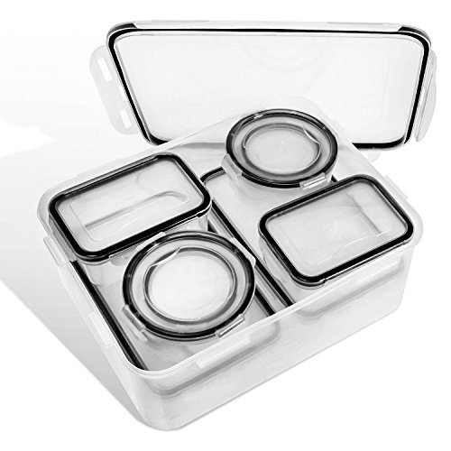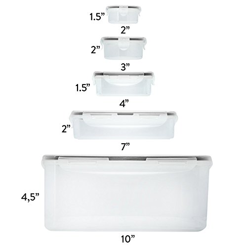 5 SIZES fulfill all your storage needs. Includes (1) 5.5L rectangular container; (2) 750ml rectangular containers; (2) 250ml rectangular containers; (2) 250ml round containers; and (2) 100ml round containers.