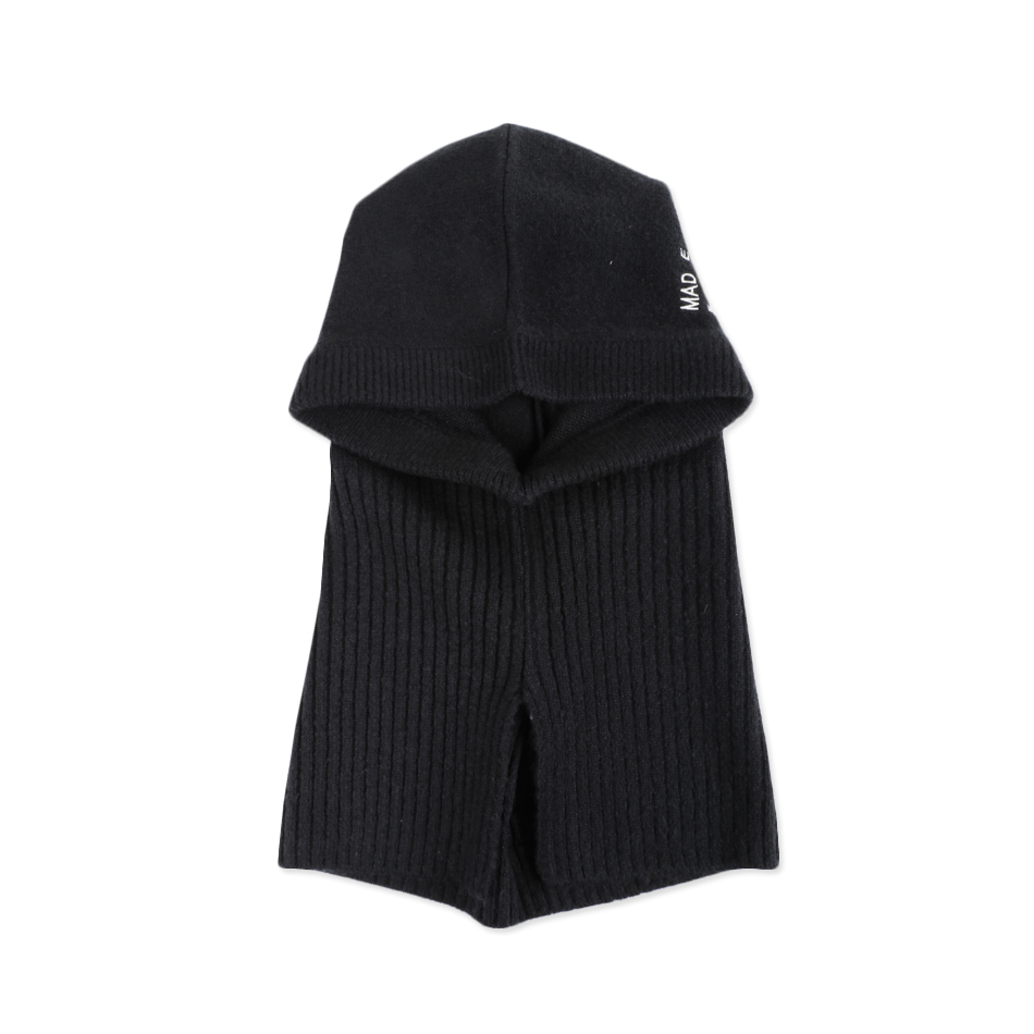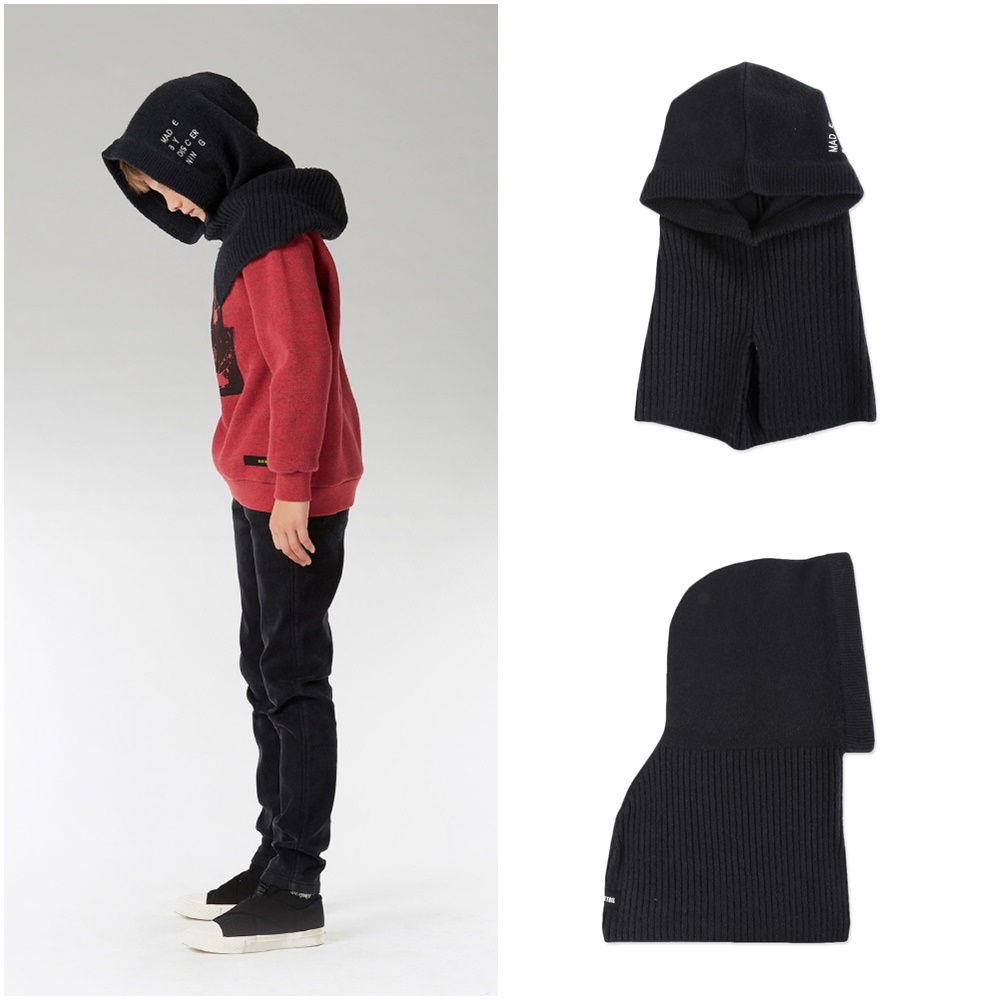 후드 옆판에 세련된 자수포인트가 제안된 딥한 컬러의 니트후드워머입니다.