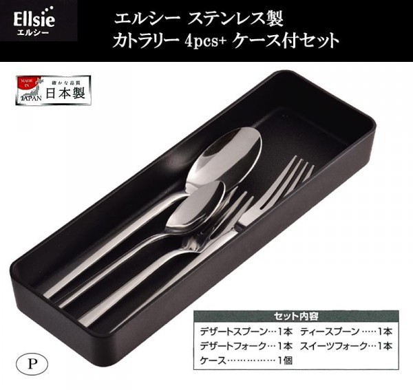 | セット内容 | デザートスプーン1本(全長143×幅20mm、17g) ティースプーン1本(全長139×幅27mm、20g) デザートフォーク1本(全長180×幅22mm、32g) スイーツフォーク1本(全長143×幅20mm、17g) ケース1個(幅80×奥行235×高さ40mm、79g) |