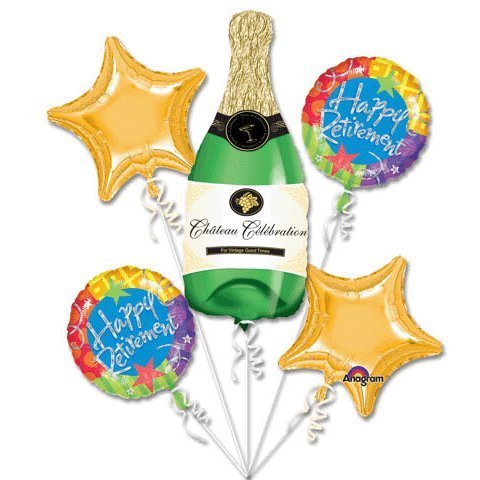 -. Feature : Retirement Balloon Bouquet / 2 gold star and 2 Happy Retirement foil ballloons (18") / 1 jumbo champagne balloon (36") / Sold flat - will need to inflate locally
