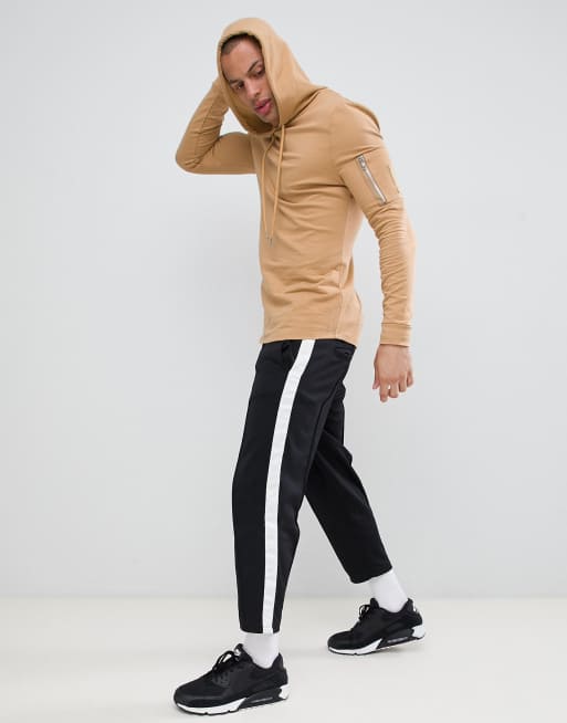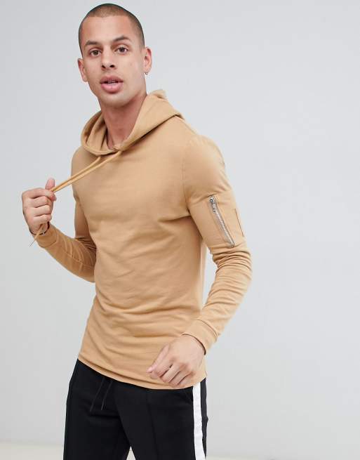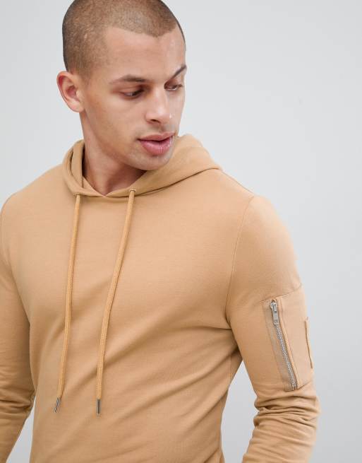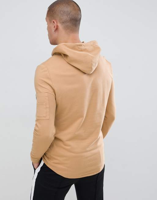ASOS DESIGN muscle longline hoodie with MA1 pocket and curved hem in beige