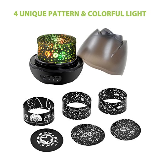 Unique Features --- ①There are 4 slides newest projection in package: Animals, Food, Birthday and Cube Geometry. All of the projection will give a magical experience; different projection can be used in different occasions. ②There are 12 songs to choose by pressing the music button which on the bottom of the lamp (the volume of the music CANNOT be adjusted). It’s good to help children relax and a good way to prevent children scared in the night.