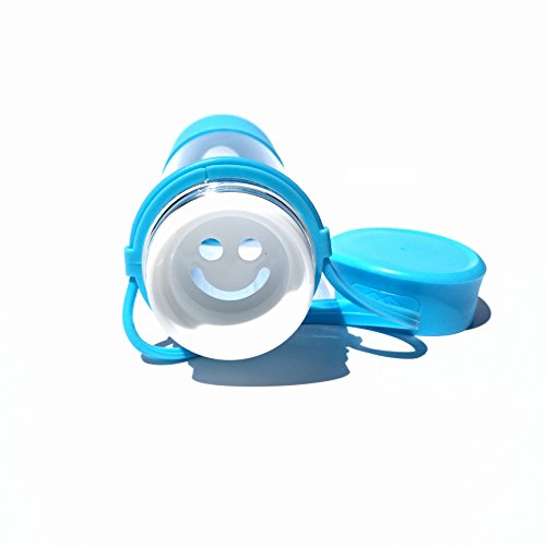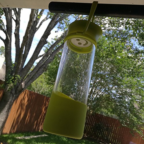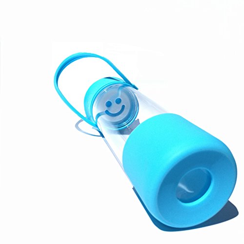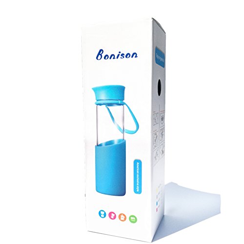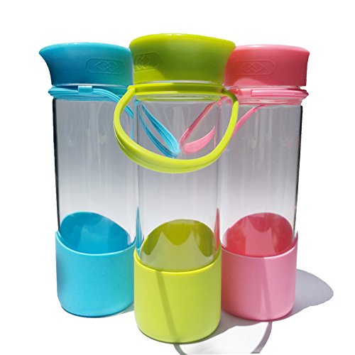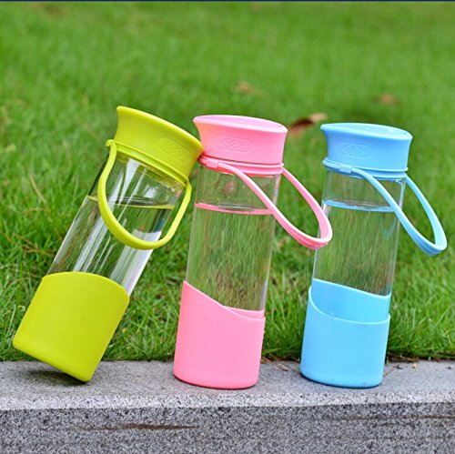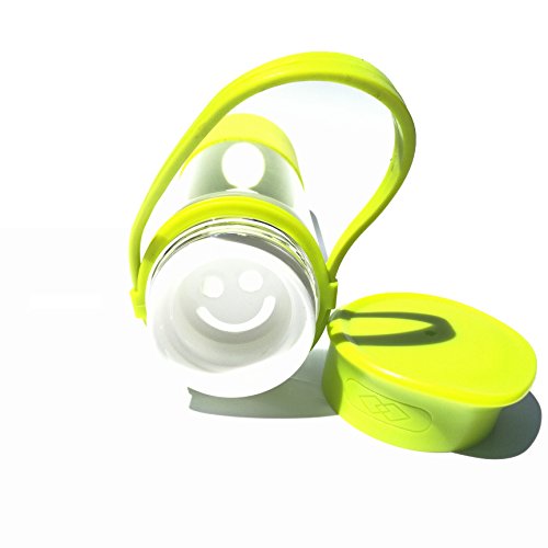 -. Feature : [High Quality - Durable - Leakproof] Carry your "happy face" emoticon around.. Get a regular dose of encouragement on those tough days. Skip the regular glass bottles that break easily and shatter. Made of high quality borosilicate glass. Not to thick to cause heavy weight discomfort when using but thick enough to feel comfortable as an everyday bottle. Cap contains silicone ring inside of the lid to prevent leakage. / [Portable & Convenient] Relaxed handle hangs approximately 3 inches down the bottle. Perfect for grabbing and going. Instead of room only for a couple of fingers, your entire hand can grab and hold securely. The thick silicone handle stretches and is able to withstand the additional weight of smoothie and detox drinks with added cucumbers, lemons, and limes. Fill with water and ice to have a cool refreshing drink during hot days. / [Non Toxic - Safe to Use] BPA Free & PFOA Free - Bottle cover sleeve and carrying handle both comP.R.Ised of 100% silicone. The Plastic smiley stopper insert is covered in silicone. All plastic top and handle holder are made of FDA approved materials that will not leach toxins into your drink beverages. Freezer Safe for chilling but do not over fill and do not freeze frozen to crack the glass. Not made for sparkling carbonated drink usage. / [Easy to Clean - Gifting] - Snug silicone sleeve that fits tightly to the bottle to ensure it will not fall off. Although not required ore recommended for cleaning purposes, sleeve can be removed. Hand washing recommended but not required. The bottle and sleeve or dishwasher safe but top rack only. Comes in a variety of colors and makes the perfect gift. Perfect from the friend or family member that is always wearing the yellow smiley face. Blue, Pink, & Green Color Variety / [Dimensions] 17 oz liquid capacity - Silicone is approximately 3 inches high from the base at its peaked curve, 2 inches at its lowest slope. Bottle measures 8.5 inches high with lid and 2.75 inches wide. 2 inch diameter wide mouth opening for ice cubes. Silicone does not provide insulation only extra protection. Glass is safe for hot and cold use but allow to cool before touching if making teas.