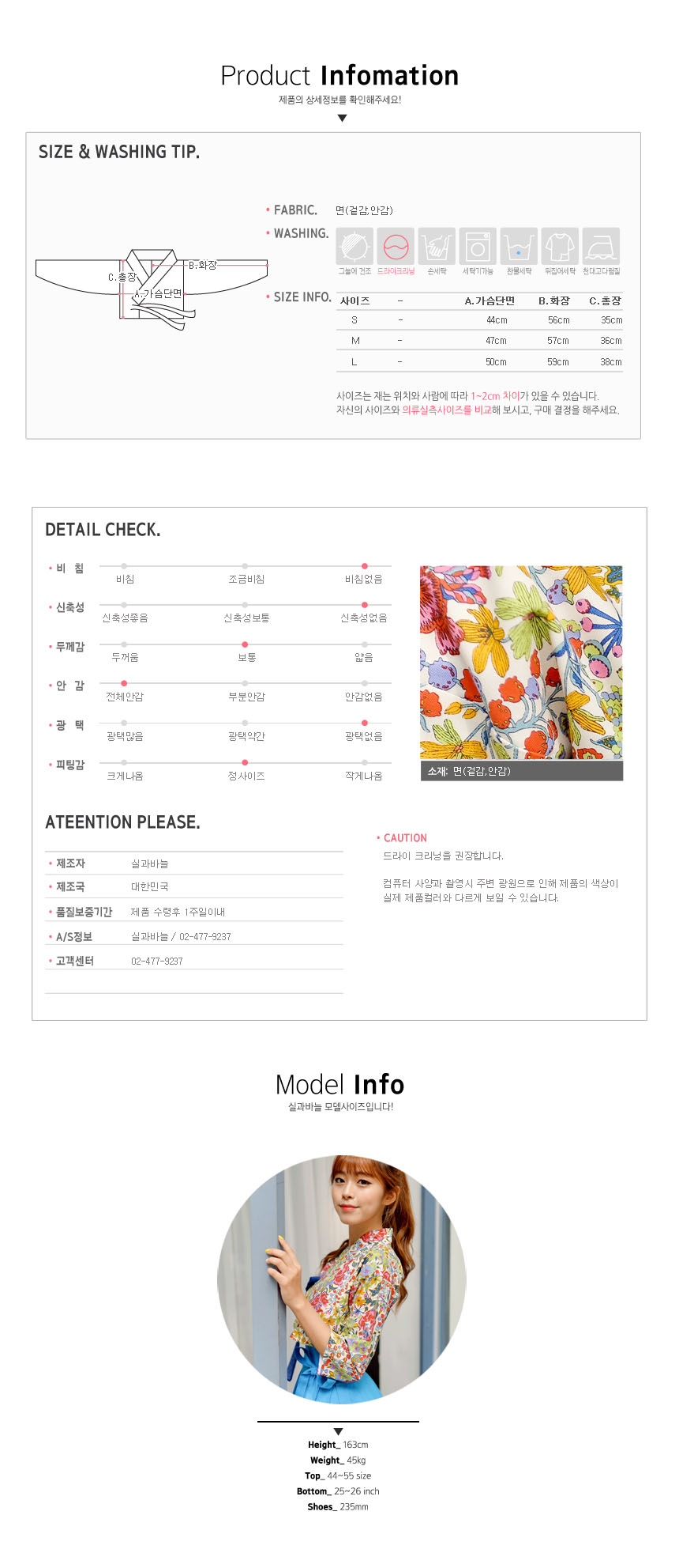 S사이즈 - 가슴단면 44cm / 화장 56cm / 총장 : 35cm