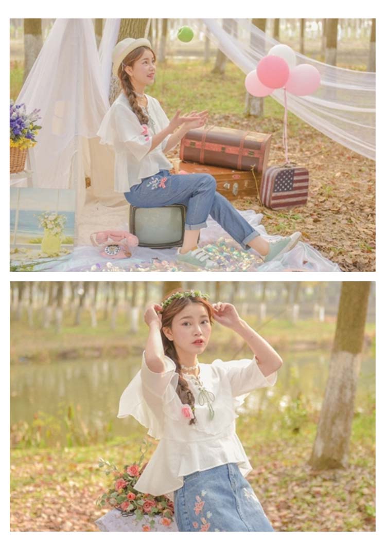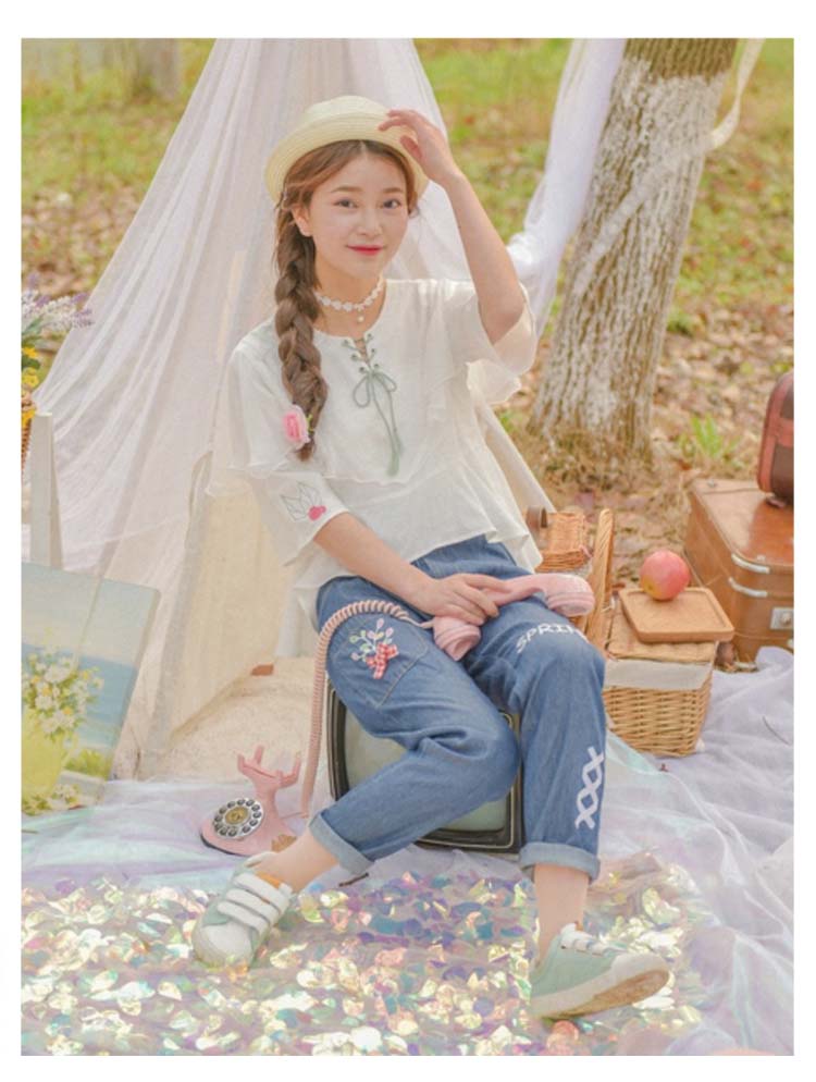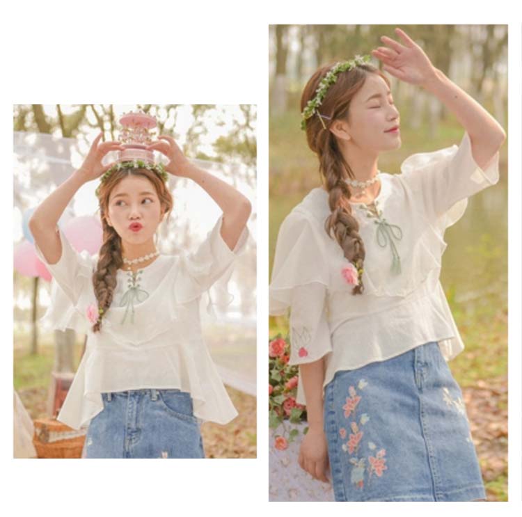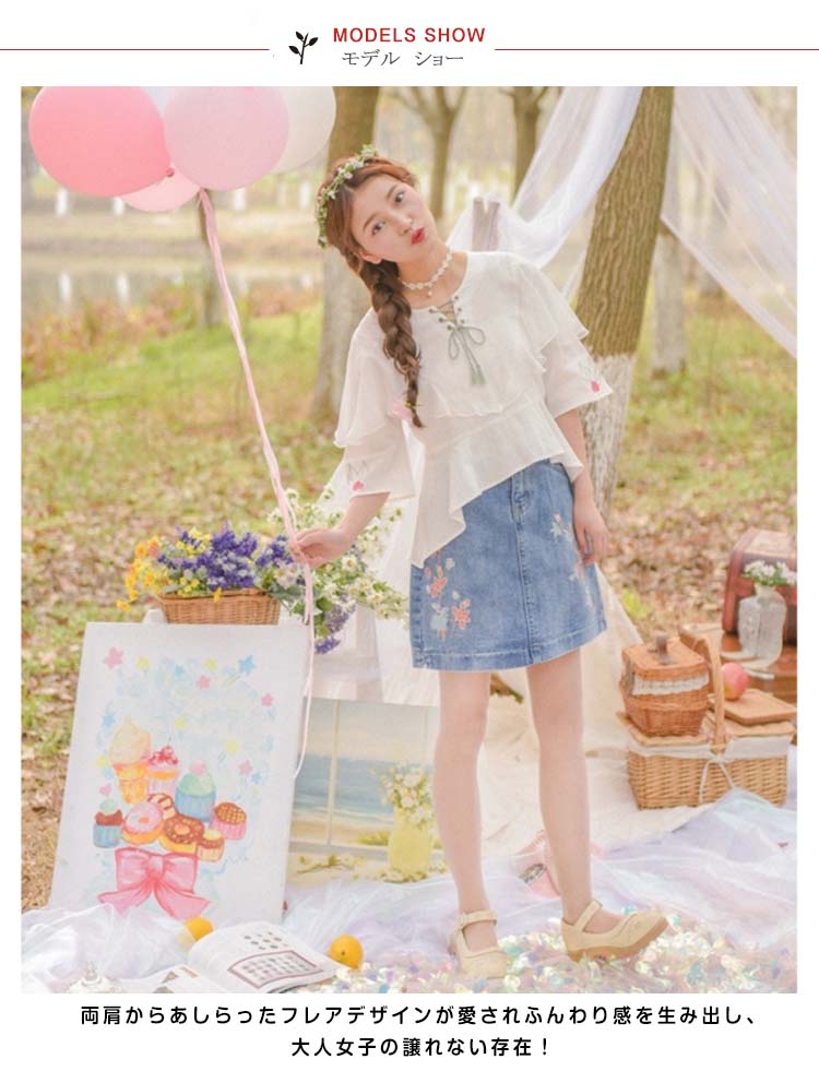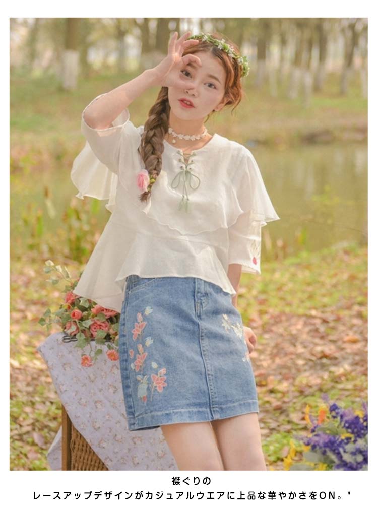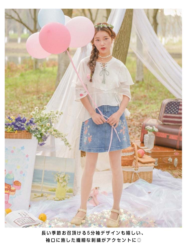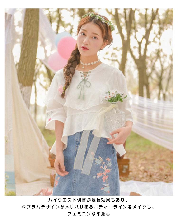 | 大人可愛いフレア刺繍トップス両肩からあしらったフレアデザインが愛されふんわり感を生み出し、大人女子の譲れない存在!ハイウエスト切替が足長効果もあり、ペプラムデザインがメリハリあるボディーラインをメイクし、フェミニンな印象◎長い季節お召頂ける5分袖デザインも嬉しい、袖口に施した繊細な刺繍がアクセントに◎襟ぐりのレースアップデザインがカジュアルウエアに上品な華やかさをON。 | |