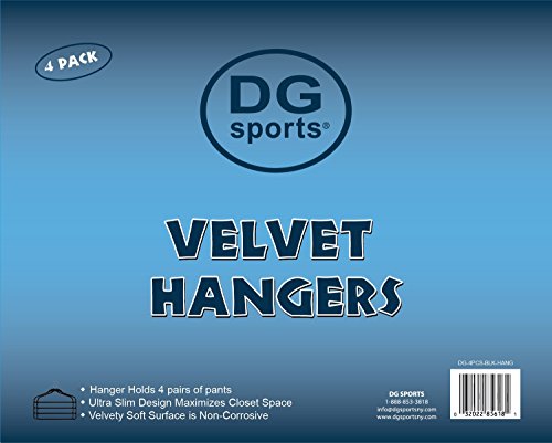 -. Binding : Kitchen -. Brand : Hangers -. Feature : Hanger Holds 4 pairs of pants, one on each tier. / Velvety Soft Surface is Non-Corrosive and material friendly protecting your clothing. / Velvet is Highly Slip-Resistant providing a Firm Hold on clothing so cloths don't slide on hanger, or fall off the hanger / Ultra Slim design maximizes closet space / Set of 4 Velvet Pants Hangers -. Label : Hangers -. Manufacturer : Hangers -. Model : 4 Pack Hangers -. MPN : 4 Pack Hangers -. PackageQuantity : 4 -. PartNumber : 4 Pack Hangers -. ProductGroup : Home -. ProductTypeName : HOME -. Publisher : Hangers -. Studio : Hangers -. Title : DG Sports® Hanger for pants Bar Pants Velvet Hangers - 4 Pack - Space Saving
