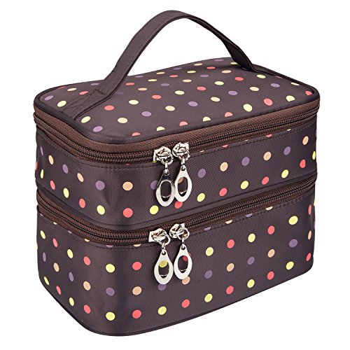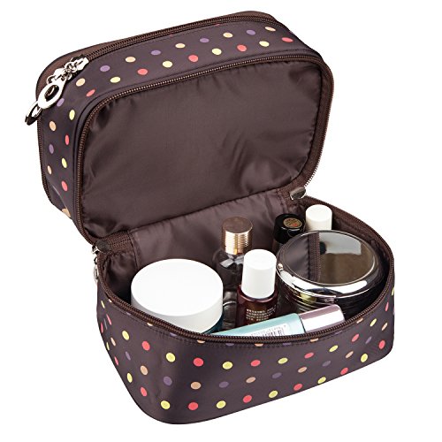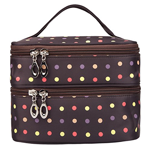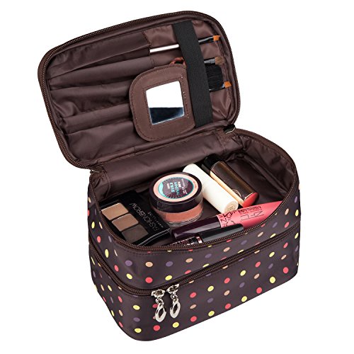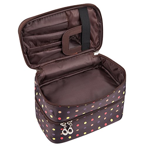Double Layer Traveling Makeup Bag Small Dots Pattern Cosmetic Bag with Mirror Small size(Coffee)