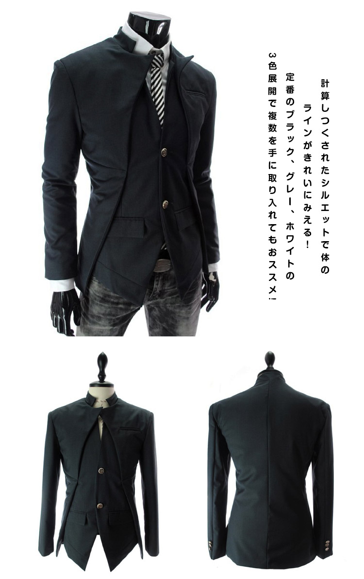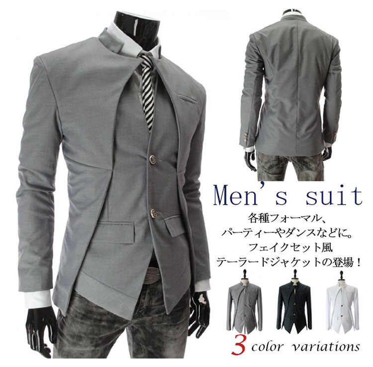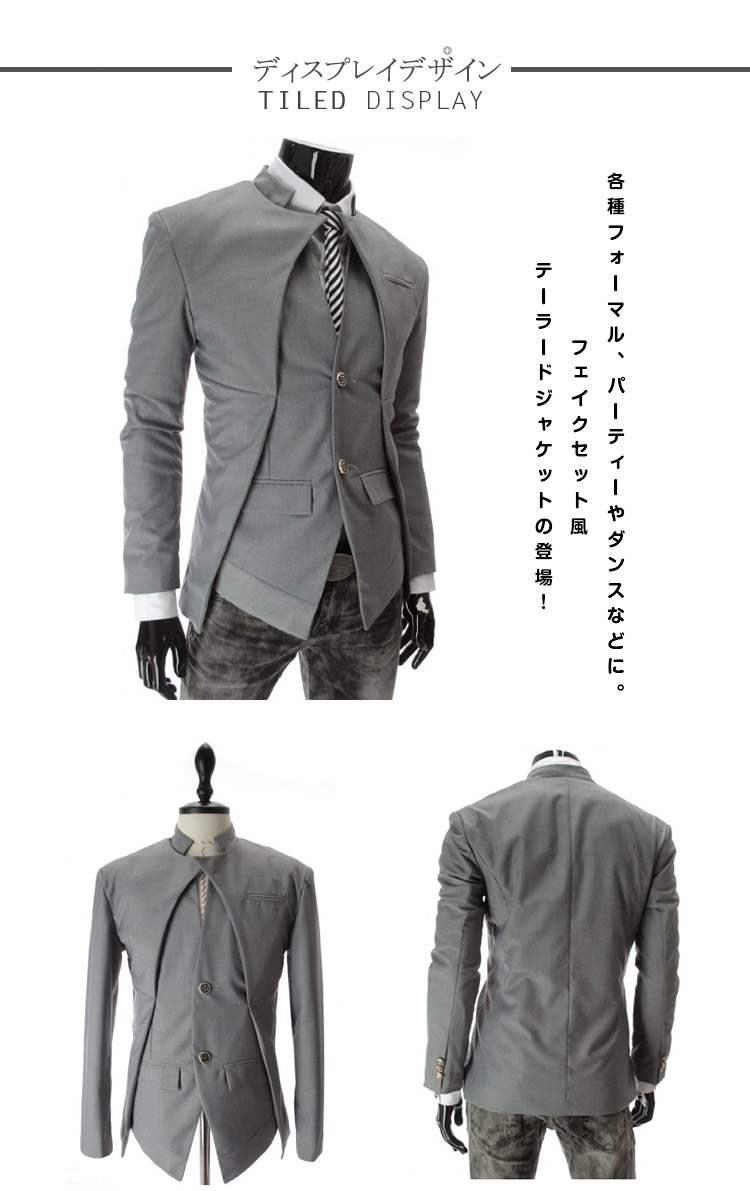 | 各種フォーマル、パーティーやダンスなどに。フェイクセット風テーラードジャケットの登場!計算しつくされたシルエットで体のラインがきれいにみえる!定番のブラック、グレー、ホワイトの3色展開で複数を手に取り入れてもおススメ!春秋の季節に大活発な一枚間違いなしです! | |