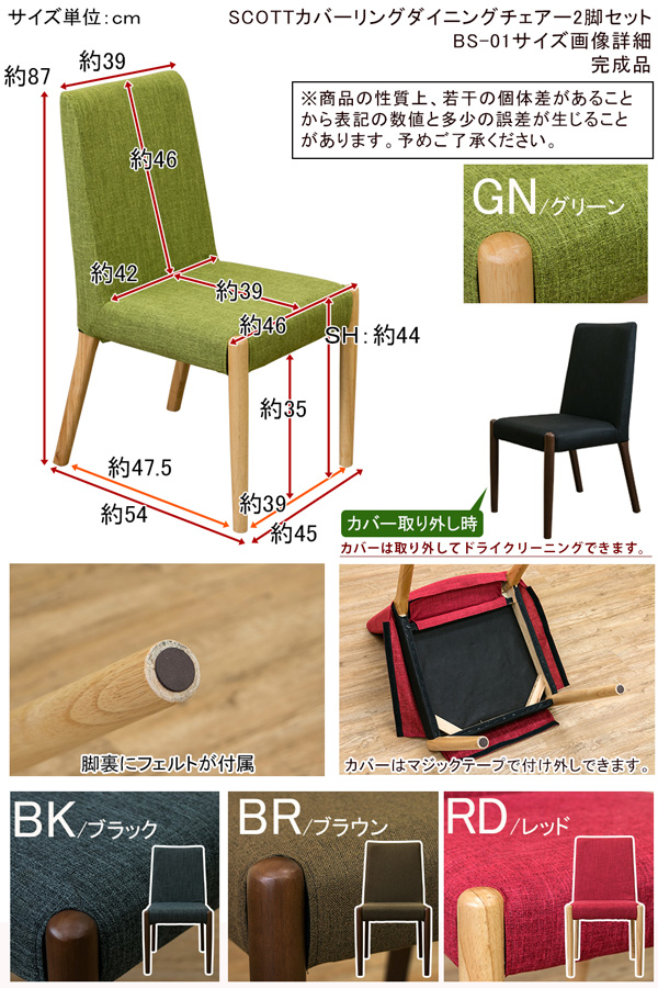本商品はお取り寄せ商品のため、稀にご注文入れ違い等により欠品・遅延となる場合がございます。誠に恐れ入りますが、何卒ご了承ください。 また、以下の場合には追加送料がかかる場合がございます。  ・大型商品の複数購入時 ・同梱区分が異なる商品の複数購入時  【出荷目安】:1 - 4営業日 ※土日・祝除く 【同梱区分】:TS 1490 【梱包サイズ】:大型商品 【代引き決済】:不可  配送伝票の依頼主は出荷元(メーカーもしくは仕入元)名となる場合がございますので、お受け取りの際はご注意ください。   【型番】bs01  【商品名の色やサイズについて】 こちらは「カバーリングダイニングチェア 【同色2脚セット】 ブラック 『SCOTT』 カバー脱着/ドライクリーニング可 天然木脚 【完成品】」の商品ページです。商品画像や商品情報には、色違いやサイズ違いの商品が載っている場合がございます。ご注文前に色・サイズ・セット内容のご確認をお願いいたします。  SCOTT カバーリングダイニングチェア 2脚入りです 同色2脚セットの販売です  カバーは取り外してドライクリーニング出来ます マジックテープで止めるようになっていますので簡単に脱着可能です 脚は丸いので可愛らしく優しい雰囲気になります  ブラック(BK)、ブラウン(BR)、グリーン(GN)、レッド(RD)の4色展開です ※BKとBRの脚の色はブラウンでGNとRDの脚の色はナチュラルです  【ご注意】 カバーを外した状態で座らないで下さい 不織布が破れる恐れがございます  幅460×奥行540×高さ870mm(梱包サイズ:幅490×奥行730×高さ910mm) 座面高:約440mm 本体重量:1脚 5.2kg(梱包重量:12.8kg) 完成品(1個口) 脚部:天然木 ラバーウッド(ラッカー塗装) 座面:カバー ファブリック(ポリエステル100%、内材 ウレタンフォーム  原産国:ベトナム  【ご注意事項】 ※本商品は、北海道・沖縄・離島への配送はいたしかねます。あらかじめご了承ください。