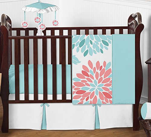 Unique Turquoise Blue and Coral Emma Baby Girls 4 Piece Floral Modern Crib Bedding Set Without Bumper
