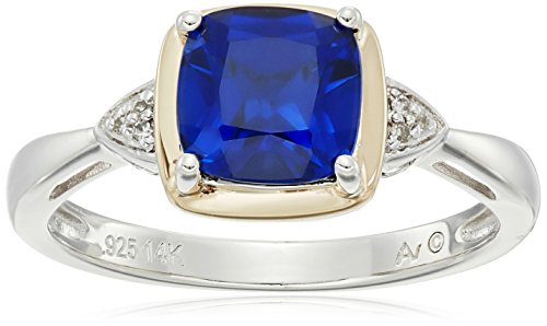 S&G Sterling Silver and 14k Yellow Gold Cushion Created Sapphire with Diamond Accent Ring, Size 7