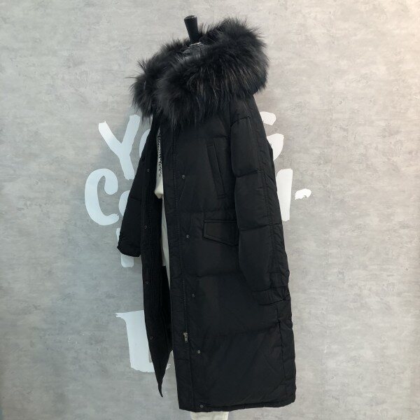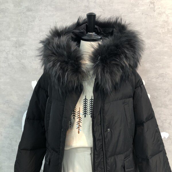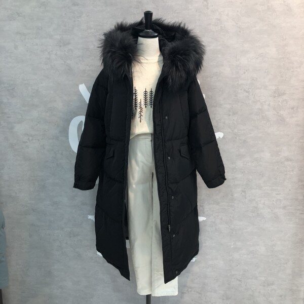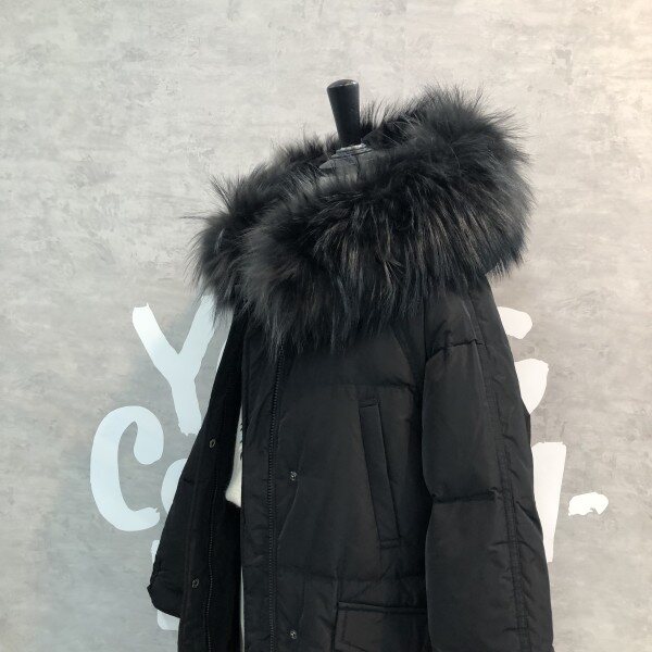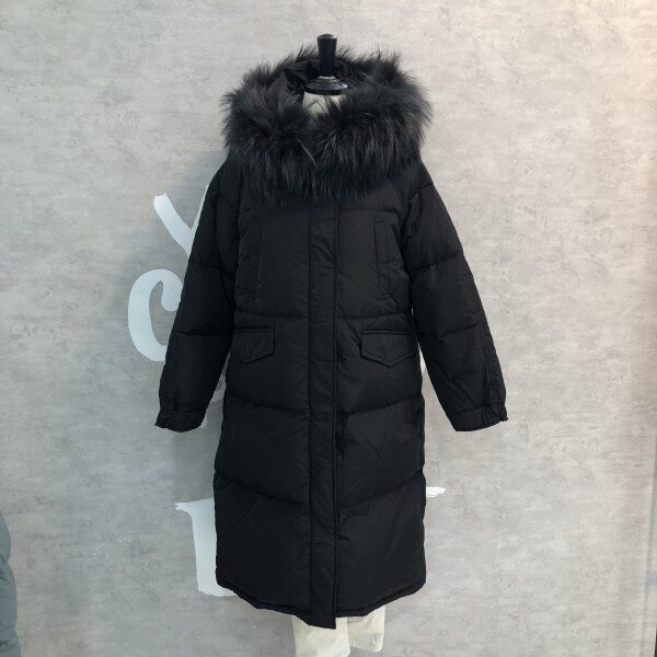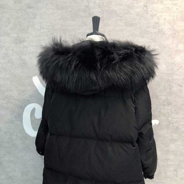 탈착 라쿤 트리밍 후드가 포인트인 롱 기장의 프리미엄 구스다운 점퍼입니다