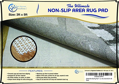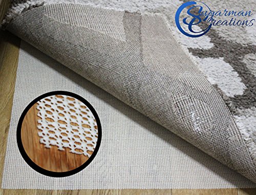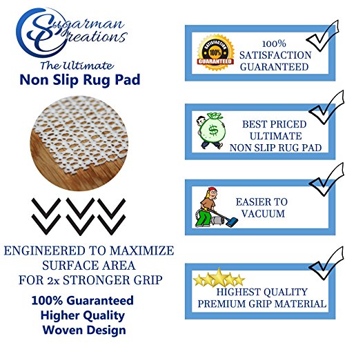 -. Feature : AMAZON'S BEST NON-SLIP RUG PAD- The ONLY pad on amazon with a unique woven design engineered to maximize surface area and therefore maximize grip potential. Proven to be 2 x as strong as anything else on the market. Unlike ANY square design construction, "thick" or "thin", which has less surface area touching the ground which equals less grip. 100% GUARENTEED, Check it out yourself! / DONT BE FOOLED BY "THICK" or "NEW" PADS- "Thick" pads and "new" foam technologies may look great at first glance but just aren't worth the extra money . After 6 months, theses pads squish to "normal" size and then tear and leave residue when attempted to adjust. Stick with a QUALITY product you can trust! Light weight, high surface area, NON SLIP, GREAT PRICE & easy to adjust. Guaranteed! / NO STICKY RESIDUE OR MARKS, EASY TO APPLY, EASY TO ADJUST- Designed to be ultra light in weight. Amazons easiest and most adjustable pad. No more residue or marks on your nice floors. This NON SLIP pad is designed for maximum grip while leaving NO residue whatsoever. / - THE NON SLIP RUG PAD: is designed to both cling to the rug backing and also the floor. This insures your rug remains flat and laid out exactly how you want it, all the time. Vacuuming your rug has never been easier, it just wont move. / - EASILY CUT TO CUSTOM FIT ANY SIZE RUG: A simple pair of scissors can cut through the pad to match any custom rug size (if needed)