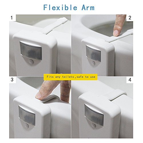 - LIGHTWEIGHT & PORTABLE DESIGN - flexible arm can be installed in seconds onto any toilet. Powered by 3 pcs AA batteries (not included ) lasts up to 10 months depending on usage. Splash Proof, Easy to clean, safe to use, and works well with any toilet seat makes it an ideal for any family be it for adults, teenagers or potty training the little one.