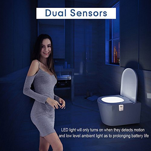 - MOTION AND LIGHT SENSING - Superior motion detection technology detects movements within 5 feet and turns on the light, automatically turns off after 64 seconds if no motion detected prolonging battery life. Dual Sensors working together, LED light will only turns on when they detects motion and low level ambient light. Otherwise, toilet light keeps off to maximize battery life time.