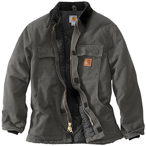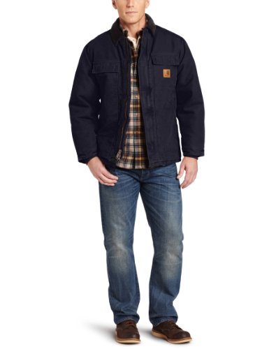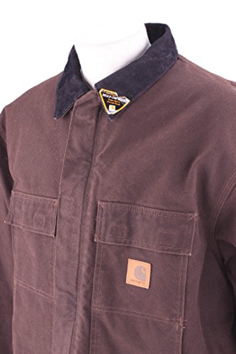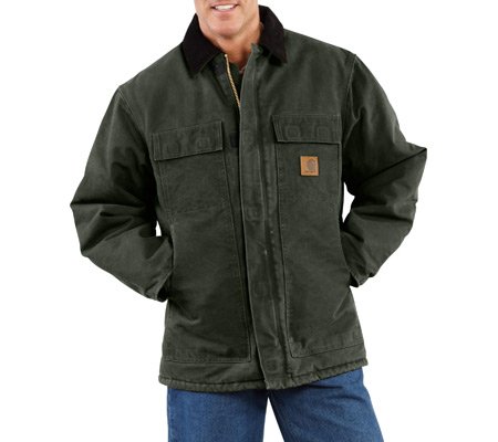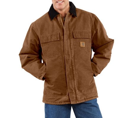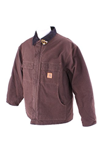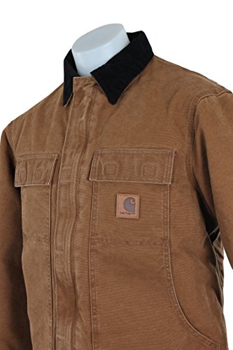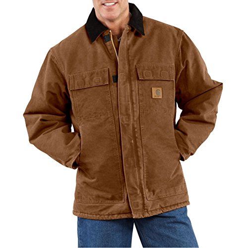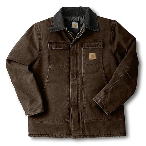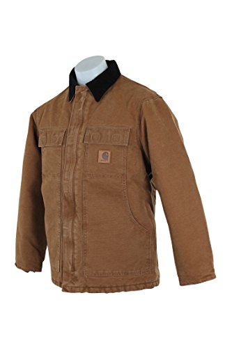 Studio : Carhartt Sportswear - Mens Publisher : Carhartt Sportswear - Mens Binding : Apparel Product Description Cold weather is no match for Carhartt's Sandstone Traditional Coat with nylon lining quilted to arctic-weight polyester insulation. Constructed of heavyweight 12-ounce, 100% cotton sandstone duck, it features rib-knit storm cuffs as well as a corduroy collar with under-collar snaps to accommodate an optional hood. There are two inside pockets, two flapped chest pockets, and two, front hand-warmer pockets. The split-back with bi-swing design plus pleated elbows make for ease of movement on the job. 0