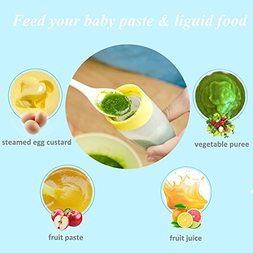 -. Feature : Made of the food-grade silicone material, BPA free, soft and comfortable, does not hurt baby's delicate gums / Capacity: 90ml , Size: 8.2 x 2 inches. Dispenses baby food one bite at a time, great for on the go / Leakproof baffle design keeps food from leaking; the dust cover keeps the bowl clean, easy to carry / Simply fill the silicone bottle with the pureed food and gently squeeze until the desired amount collects on the spoon to feed baby / Perfect for giving your baby milk, formula, soup and other liquid food, convenient one hand feeding and easy to feeding