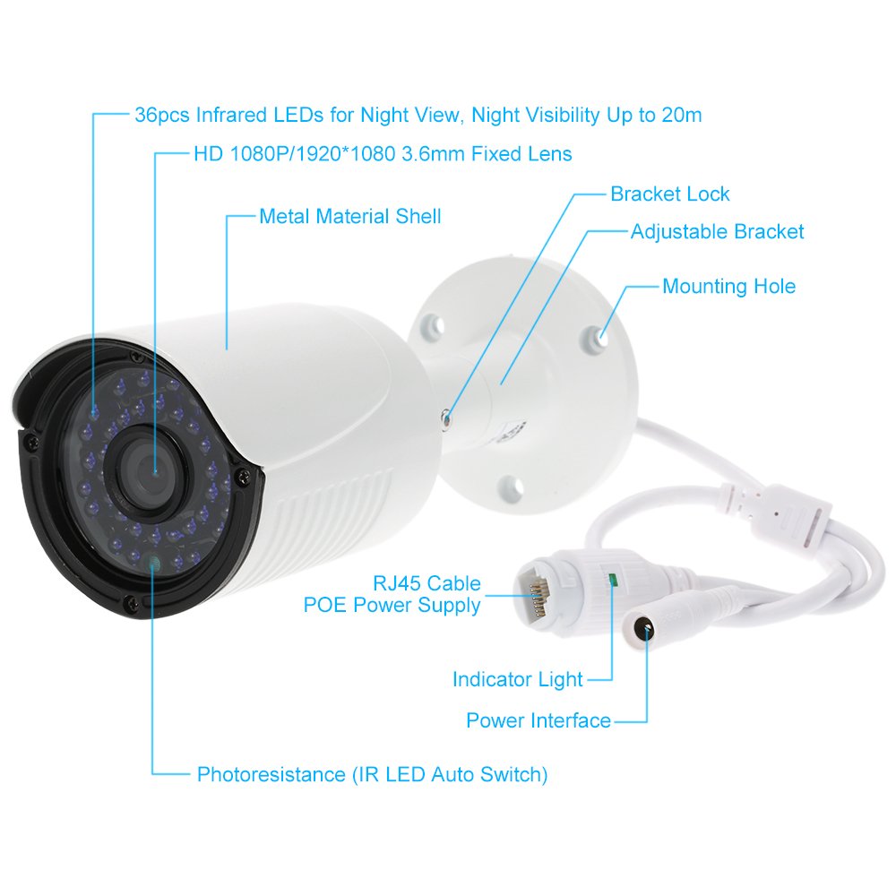 36pcs infrared lamp, 3.6mm lens with night visibility distance up to 20m.