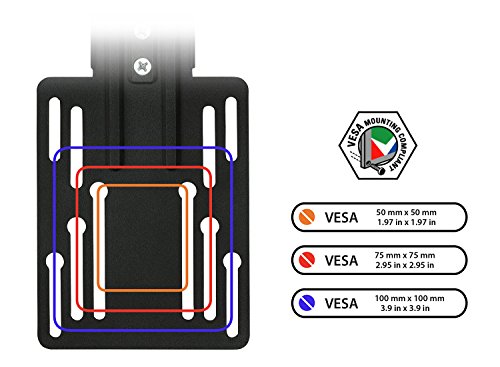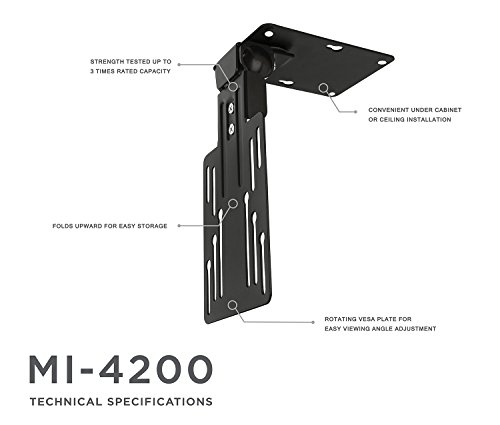 -. Feature : Mount-It! MI-LCDCM folds conveniently up into the mount for easy storage and contemporary design. The bracketed mount swivels and tilts to create ergonomic positioning and easy viewing of your device. This TV display mount has been strength tested at maximum capacity of 18lbs ensuring a safe grip on your device / This monitor arm mount is ideal for ceilings, bedrooms, offices, kitchens, and workspaces. The easy folding and unfolding features make room for supplies, notes, kitchen appliances, spreadsheets, and keyboards. These mounts are also designed for pitched ceilings and corner installations. The tilting and swiveling also make your screen an easy-access device. Use it for touch screen displays to access cook books, e-mail, stocks, or the news all from under your cabinet / The rigorous testing of our mounts confirm their stability and strength. It can hold 13 to 23 inch displays with ease. As shown in the photos, this is VESA compatible with 50x50mm, 75x75mm, and 100x100mm brackets. The 18lbs load capacity was comfortably out performed by engineer stress tests. The articulating functions hold up well under most modern displays / The tilt, swivel, and fold features offer a variety of ergonomic settings for your display. The tilt ranges from 0 to 110 degrees. It swivels left and right 360 degrees covering a wide array of possibilities. The arm of the under cabinet television mount that is connected to the TV is ultra slim which minimizes hardware visibility and makes it as light as possible / Black Heavy gauge steel construction supports up to 18lbs. Our TV mounts are made with high grade quality rugged materials. All mounting hardware is included with the mount. The arm is a modern black color matching the black brackets on most LCD, LED, and Plasma displays. The decor of this device seamlessly fits in with contemporary home design. And the low profile folding features keep the screen and arm hidden when you want it out of the way