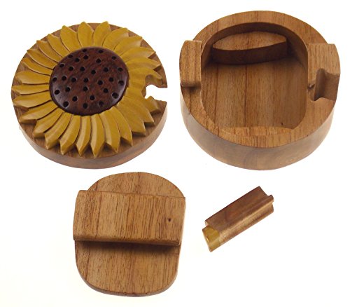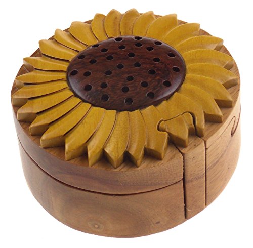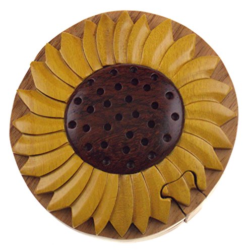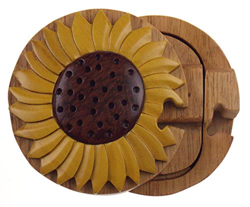 Studio : Hickoryville Publisher : Hickoryville Binding : Kitchen Product Description Handmade carved Sunflower intarsia wood puzzle box bundled with Hickoryville instructions on opening and closing the puzzle box. This secret puzzle box is a beautifully handcrafted creation, high quality workmanship, made of natural wood. The box is a puzzle that comes apart into four pieces and discovers a secret space to keep special treasures. Inside storage space is approximately 2.6 inches long x 2.6 inches wide. Every box is a unique, handcrafted creation and yours may vary slightly from the photos. 0