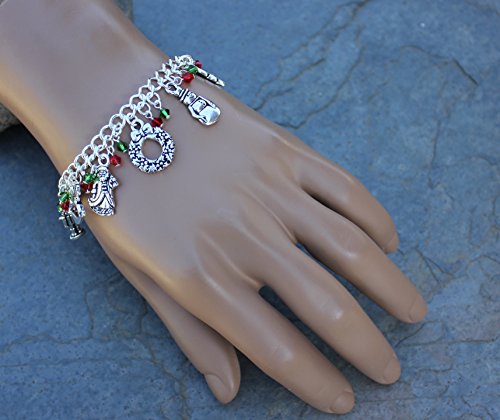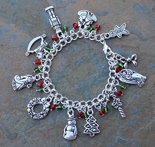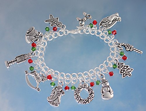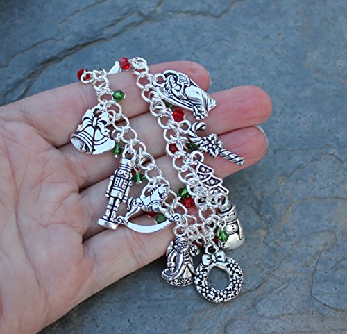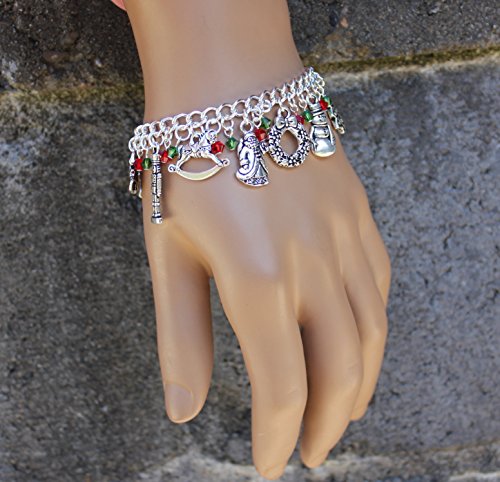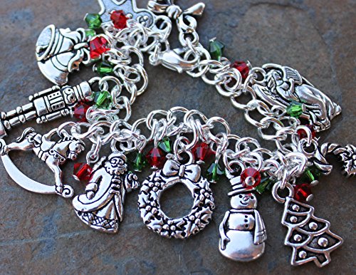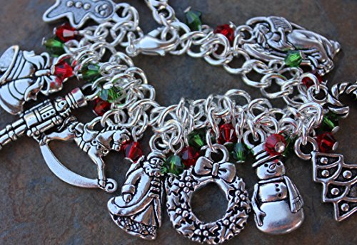 -. Feature : 11 Christmas themed silver plated pewter charms: gingerbread man, bells, nutcracker, rocking horse, Santa Claus, wreath, snowman, Christmas tree, candy cane, angel with harp, and a bow. / Silver plated steel chunky chain. Lightweight and strong. Sparkly Swarovski crystal dangles in Fern Green and Light Siam Ruby. / Available in sizes XS (6.5 inches), S (7 inches), M (7.5 inches), L (8 inches), and XL (8.5 inches). PICK YOUR SIZE FROM SIZE CHOICE BOXES BENEATH TITLE. / Handmade in the USA by Night Owl Jewelry. / Charms are made in USA and are lead and nickel free. Charms range from 1/2 inches to 1 inch long.