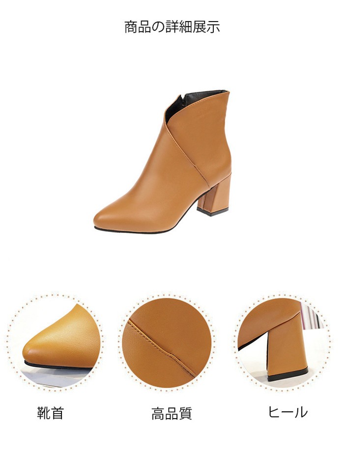 サイズ:22.5~25cm約表面の材質:PU裏面の材質:快適な材質ヒールの高さ:6~8cm約商品内容:1x靴サイズ:34:22cm 35:22.5cm 36:23cm 37:23.5cm 38:24cm 39:24.5cm 40:25cmショートブーツレディース ヒール 女性のアンクルブーツ シューズ ファスナー式靴 秋冬物 シンプル くつレディース用のアンクルブーツが登場カラーもシルエットもとても組み合わせしやすくて、どんな場合にも使える上品な一足
