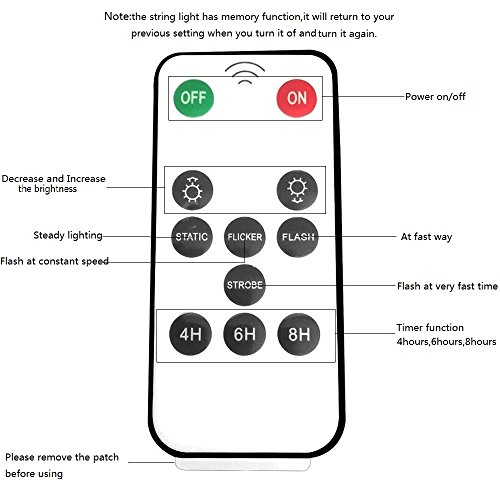 - 1.Remote Control:Updated remote controller with brightness setting ,decrease or increase the brightness;4 lighting modes:static,flicker,flash and strobe ;4h,6h,8h timing function,so you control the time of lighting.