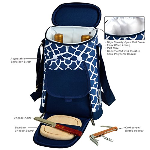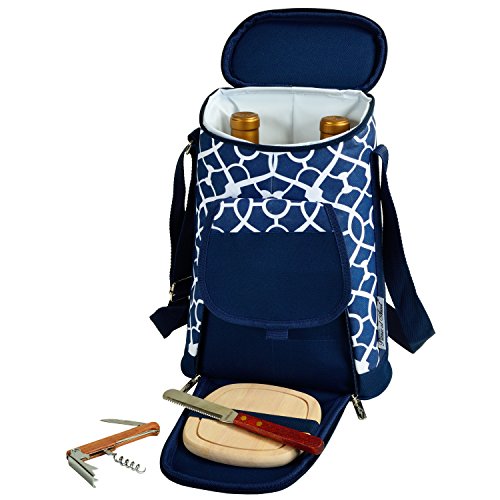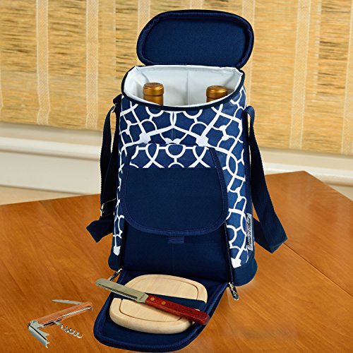Picnic at Ascot Stylish 2 Bottle Insulated Wine Tote Bag with Cheese Board, Knife and Corkscrew - Trellis Blue