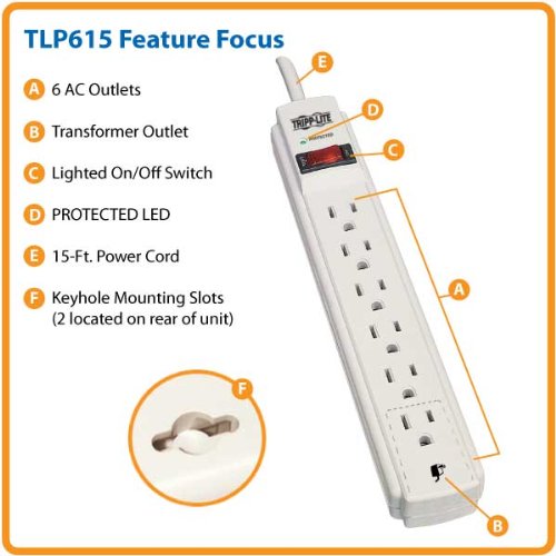 Tripp Lite 6 Outlet Surge Protector Power Strip 15ft Cord 790 Joules LED & $20K INSURANCE (TLP615)