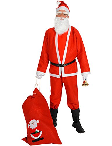 -. Feature : Please note: Estimated Delivery is actually 7 - 10 Working Days. Tracked service as Standard. / Get into the holiday spirit without spending all the Christmas budget with our Santa costume! / Includes a pair of bright red trousers, a red top with white trim, a belt, white beard and Santa hat. / Excludes Santa sack, glasses, eyebrows, white gloves and bell. / The trousers have an elasticated waistband for a comfortable fit which will last through the festive season.