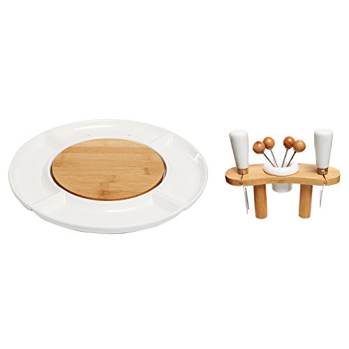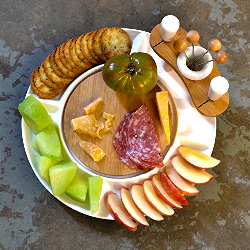 White Ceramic & Bamboo Wood Party Platter Serving Set - Cheese Board, Knife & Fork, 4 Hors d'oeuvre Picks