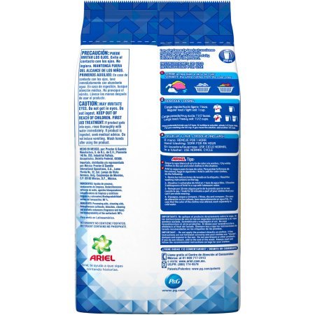 Binding : Health and Beauty Product Description Instructions: . Read the instructions carefully before using the product. Instructions for use. 1 Separate the white clothes from the color ones. 2 Dosing. Regular load / light soil: 1 cup. Large load / heavy soil: 1 1/2 cups. For pre-washing use 1/2 cup. If you reuse the solution, add another 1/2 cup. 3 Dissolve and Wash. Hand Washing: Soak for an hour. In a Washer: Use normal cycle. Ariel Tips:. Dry white clothes in the sun and color clothes in the shadow. Ariel is safe for color clothes, do the following:. 1.- Read the washing instructions on the bag. 2.- Dissolve 2 tablespoons of Ariel in a cup with lukewarm water. 3.- Soak for 20 minutes a part of your clothes that you can't see while wearing. 4.- Rinse, dry and compare. In case that the color of the clothes was altered, wash separately in cold water. 0
