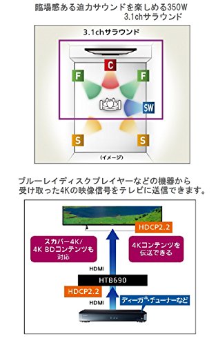 -. Feature : ● speaker portion use unit: front speakers (L / R): Full range 6.5cm cone type × 1 / ch / center speaker: full-range 6.5cm cone type × 1 / active subwoofer: woofer 16cm cone type × 1 ● amplifier section: A Practical maximum rated output (surround mode, when each channel operation) Front (L / R): 70W + 70W (1kHz, 6Ω, subwoofer: 140W / ※ power (body): AC100V (50 / 60Hz) / power consumption (body): 44W / active subwoofer: about 27W ◆ ※ power in the specifications if AC100V (of 50 / 60Hz), We recommend that you drop the voltage to AC100V to such as transformers. (Power consumption also make sure.) / Dimensions (body): When every other table: Width 950 × height 55 × depth 120mm / wall hanging at the time: Width 950 × height 125.5 × depth 57.2mm / (active subwoofer): Width 180 × height 378 × depth 303mm Mass: when every body table: about 2.5kg / wall-mounted time: about 2.5kg / active subwoofer About 4.7kg / Accessories: Remote control × 1, HDMI cable × 1 (1.5m), power cord × 2, Ir system cable × 1, wall-mounted bracket × 2, screw × 2 / Japanese manual download site URL: http://panasonic.jp/theater/p-db/SC-HTB690_manualdl.html
