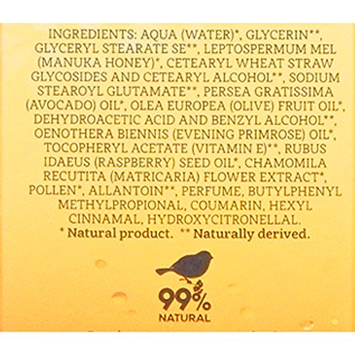 -. Feature : A deeply hydrating moisturising cream with pure manuka honey / Also contains Avocado, Evening P.R.Imrose, Olive and Rapsberry Seed oils for insttant hydration and softness / With chamomile to soothe irritated skin / Cruelty-free, paraben free, no mineral oil