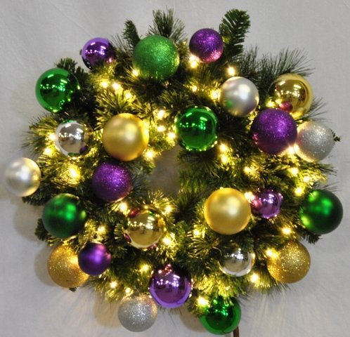 Queens of Christmas WL-GWSQ-03-MARDI-LWW Pre-Lit LED Sequoia Christmas Wreath Decorated with The Mardi Gras Ornament Collection, 3', Warm White