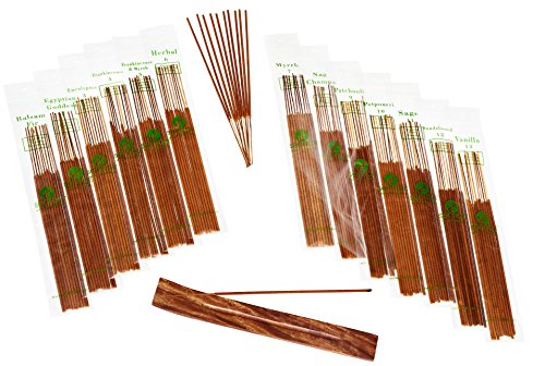 - 12 ASSORTED SCENTS (plus you get 10 bonus sticks!) - Balsam Fir, Egyptian Goddess, Eucalyptus, Frankincense, Frankincense & Myrrh, Herbal, Myrrh, Nag Champa, Patchouli, Potpourri, Sage, Sandalwood, Vanilla. PLUS an ash catcher!