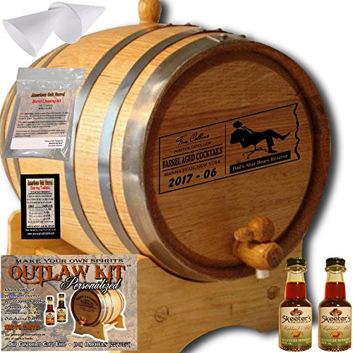 Studio : American Oak Barrel Publisher : American Oak Barrel Product Description Branded backside with Skeeter's face, insures this is a Certified, Authentic American Oak Barrel Product! Personalized Outlaw Kit "MADE BY" American Oak Aging Barrel - Design 078: Dad's After Hours Reserve - Master Distiller Series............This vessel is handcrafted from American white oak, bound by 6 hoops of steel and features a stunning laser engraved design celebrating Dad's endeavors! Outlaw Kit includes Skeeter's Reserve Premium Essence necessary to create your own Spirit Masterpiece! The barrel is perfectly charred to release the sugar from the oak. After the firing process, the sugar caramelizes on the inner wall and is critical to mellowing the decanted spirit. The longer your spirits age in this barrel the smoother, refined or mature it becomes. Easily accommodates 2 fifths of spirit. Please enjoy responibly! 0