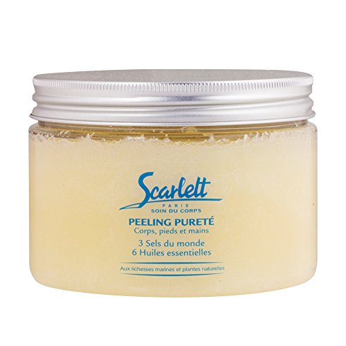 ABOUT THIS PRODUCT SCARLETT PARIS® Purifying Body, Hand, and Foot Scrub eliminates dead skin cells and impurities to reveal silky-soft, radiant skin and boosts the penetration of other active ingredients. With an intoxicating fragrance, this delicate scrub invites you to escape, and three different kinds of salt gently exfoliate and rid the skin of dead cells that clog the pores and dull the complexion. These salts come from France, the Himalayas, and the Dead Sea, and were selected for their richness in minerals and trace elements. A cocktail of lavandin, petitgrain (orange blossom), cypress, geranium, rosemary, and chamomile essential oils scent the skin pleasantly and promote calming and relaxation. Skin feels revitalized and silky soft, glowing with a new radiance with no oily film left behind.