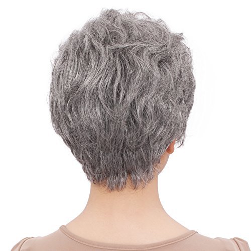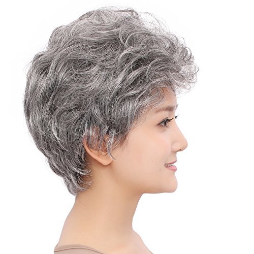 BESTUNG Short Silver Gray Synthetic Wigs Fluffy Little Curly Wavy Mom Grey Costume Wigs For Old Middle Age Women Office Lady (Silver Grey)