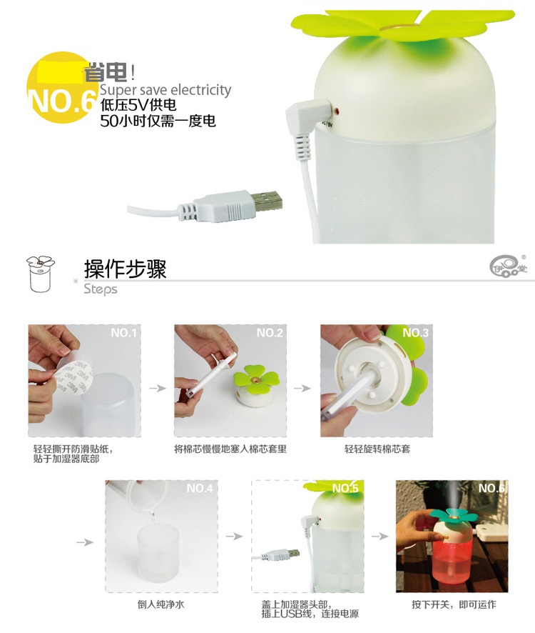 This product uses a USB cable to the computer or connected to the adapter, the product input voltage DC5V; for the first time use or not in use for a long time, cover with the lid, wait 3 minutes to allow full wet absorbent sponge fully absorb moisture; this product comes with an absorbent cotton swab.