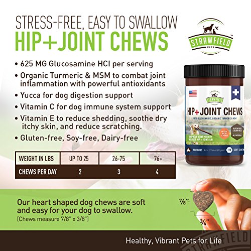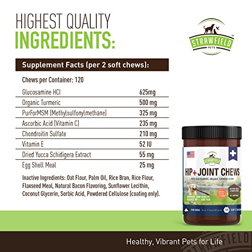 Does your pet sit around reminiscing about the "good ole days" when they could catch a tennis ball in a single bound, run faster than a passing car, and still strike fear into unexpecting joggers? Wouldn't you love to see the look of surprise on the taunting kids' faces when your dog is suddenly able to bound off of the porch at warp speed in their direction? Maybe it's time for Strawfield Pets Hip and Joint Supplements. Our supplements for dogs joints weren't scientifically engineered by NASA, but they were formulated with premium ingredients in the U.S.A. in our NASC Inspected Laboratory following strict cGMP guidelines so you can trust our hand crafted quality. We included 120 Glucosamine Chondroitin joint chews in every jar. Each bite contains Organic Turmeric & MSM to combat joint inflammation with powerful antioxidants, Yucca for dog digestion support, Vitamin C for dog immune system support, Vitamin E to reduce shedding, soothe dry itchy skin, and reduce scratching. Did we leave anything out? Yep, we left out the fillers so our delicious dog chews are completely Gluten Free, Soy Free, and Dairy Free. Our pet supplements are perfect for young, aging, and senior dogs from small, medium, and large breeds and each Natural Bacon Flavored bite is soft, chewable, and oh so yummy. We love our pets and we'd love to adopt you into our family of customers but we understand you may have reserverations. So don't worry, we proudly honor a no questions asked return policy we call the Strawfield Pets Promise. Thanks for your support of our family business, we truly appreciate you.Feature
