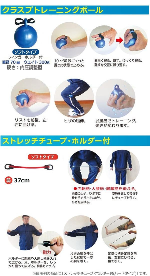| セット内容 | クラスプトレーニングボール(ソフトタイプ)、ストレッチチューブ・ホルダー付(ソフトタイプ)、カラビナ |