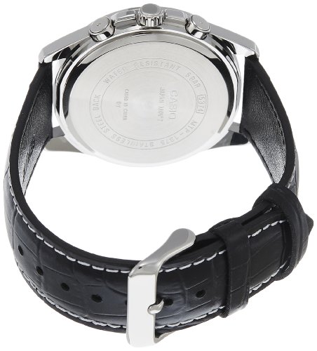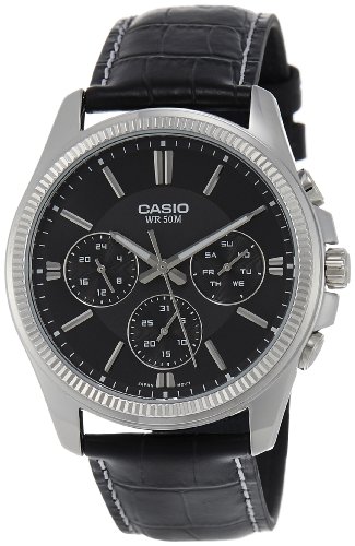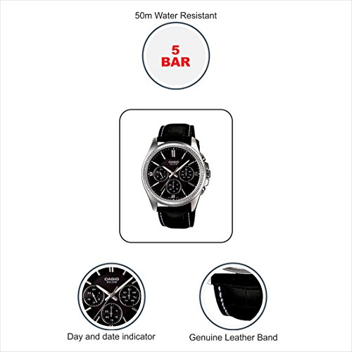 Brand, Seller, or Collection Name:Casio Model number:MTP-1375L-1AVDF (A838) Part Number:MTP-1375L-1 Item Shape:ROUND Dial window material type:Mineral Display Type:Analog Clasp:Buckle Case material:Stainless steel Case diameter:35 millimeters Case Thickness:9.7 millimeters Band Material:Leather Band width:20 millimeters Band Color:BLACK Dial color:Black Bezel material:Stainless steel Calendar:Day and date Special features:N/A Movement:Quartz Water resistant depth:200 Meters