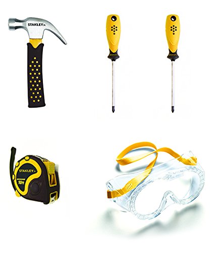 - Set includes two screwdrivers, a hammer, a tape measure and safety goggles