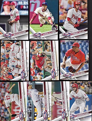 This is a Philadelphia Phillies 2017 Topps Baseball Regular Issue complete mint 19 card team set; it was never issued in factory form. It includes all Phillies Cards from series #1 and #2 including Aaron Altherr, Jorge Alfaro, Vince Velasquez, Peter Bourjos, Tommy Joseph, Odubel Herrera, Maikel Franco, Jeanmar Gomez, Jerad Eickhoff, Hector Neris, Cameron Rupp, Freddy Galvis, Roman Quinn, Andres Blanco, Jake Thompson, Jeremy Hellickson, Cesar Hernandez, Aaron Nola and a Phillies Team Card.