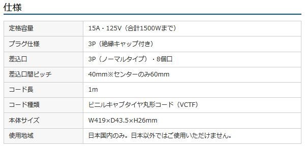 8個口(3P)、VCTFコード仕様、3Pプラグ(絶縁キャップ付き)のタップです。電源状態が確認できる通電ランプ付き。裏面にマグネットが付いているので、スチールのデスクなどに仮固定することができます。メンテナンスがしやすく便利です。 |