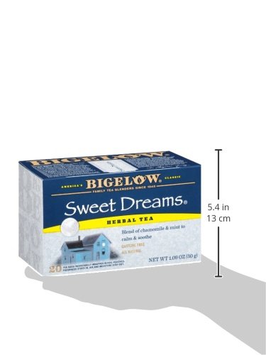 -. Binding : Grocery -. Brand : Bigelow Tea -. EAN : 0072310000865 -. Feature : Pack of six 20-count boxes of calorie-free herbal tea (120 total tea bags) / Fine herbal tea blended with chamomile, peppermint, rose blossoms, spearmint, spices, and orange blossoms / Caffeine-free and gluten-free, with no calories and no carbohydrates; Kosher Parve, 100% natural / This soothing herb tea relaxes and refreshes with all-natural flavors / Ships in Certified Frustration-Free Packaging -. IsAdultProduct : 0 -. Label : Bigelow -. LegalDisclaimer : Actual product packaging and materials may contain more and different information than what is shown on our website. We recommend that you do not rely solely on the information presented and that you always read labels, warnings, and directions before using or consuming a product. -. Manufacturer : Bigelow -. Model : 7231000086 -. MPN : 1086 -. NumberOfItems : 6 -. PackageQuantity : 6 -. PartNumber : 1086 -. ProductGroup : Grocery -. ProductTypeName : GROCERY -. Publisher : Bigelow -. ReleaseDate : 2006-06-22 -. Size : 6 Pack -. Studio : Bigelow -. Title : Bigelow Sweet Dreams Herbal Tea, Relaxing Blend of Chamomile & Mint, Caffeine Free, 20-Count Boxes (Pack of 6) -. UPC : 072310000865