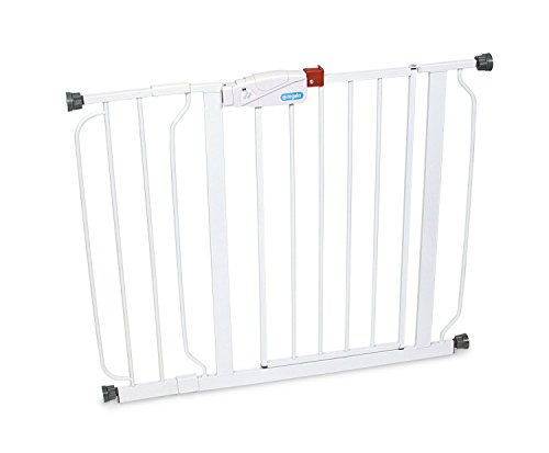- Feature : Pressure mounted - Easy to install and remove - Can be used at top of stairs if included wall cups are utilized to more firmly affix gate / Expands from 29-34 inches wide and includes a 6-inch wide extension kit for openings up to 40-inches wide / Lever style handle with safety lock offers an easy one touch release / Perfect for doorways and staircases - Convenient walk through and durable steel design / Juvenile Products Manufactures Association certified; Great for Pets too!