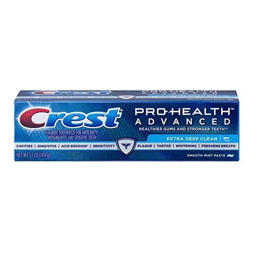 Sold as Pack of (3), 5.1 oz each Crest Pro-Health Advanced Extra Deep Clean Smooth Mint Paste. Crest Pro-Health Advanced Extra Deep Clean Smooth Mint Paste. Fluoride toothpaste for anticavity, antigingivitis and sensitive teeth. Healthier gums and stronger teeth**. Extra deep clean. Cavities. Gingivitis. Acid erosion*. Sensitivity. Plaque. Tartar. Whitening. Freshens breath. Net Wt 5.1 OZ (144 g) Uses: Aids in the prevention of cavities. Helps prevent gingivitis. Helps interfere with the harmful effects of plaque associated with gingivitis. Helps control plaque bacteria that contribute to the development of gingivitis. Builds increasing protection against painful sensitivity of the teeth to cold, heat, acids, sweets or contact. Extra deep cleans unique formula: Cleans beyond what you can see. Continues to work between brushings. Provides Crest's highest level of protection against plaque bacteria. *Acid erosion effects: aAcids in everyday foods can soften and thin enamel, leaving teeth less white, weaker, and sensitive. **Fights plaque and gingivitis. Strengthens enamel. Crest Pro-Health Advanced Extra Deep Clean Smooth Mint Paste Toothpaste: Healthier gums by preventing gingivitis Stronger teeth by strengthening enamel Cleans beyond what you can see Continues to work between brushingsFeature
