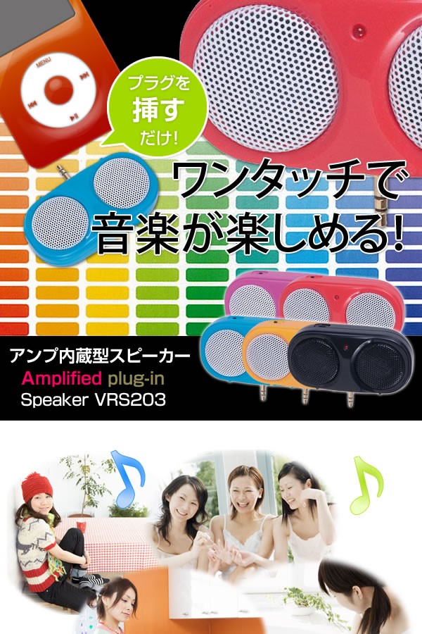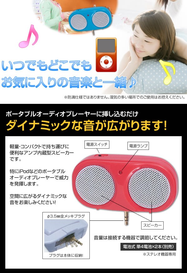 | 軽量・コンパクトで持ち運びに便利なアンプ内蔵型スピーカー。お手持ちのポータブルオーディオプレイヤーにプラグを差し込むだけで、ワンタッチで音楽を楽しめます♪カラバリも豊富。 |